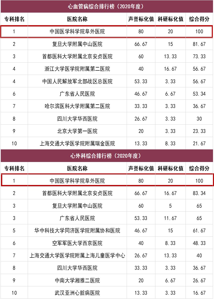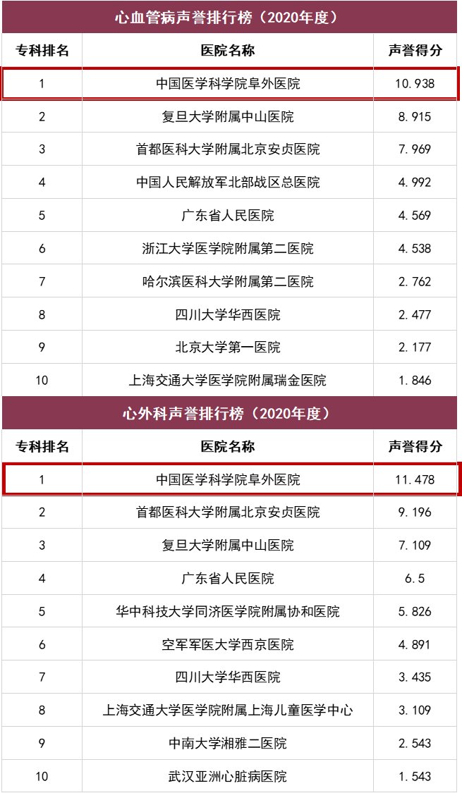 2021年11月20日,复旦大学医院管理研究所发布“复旦版中国医院排行榜”。中国医学科学院阜外医院连续十二年荣列中国最佳医院专科声誉排行榜(心血管病、心外科)、专科综合排行榜(心血管病、心外科)榜首。